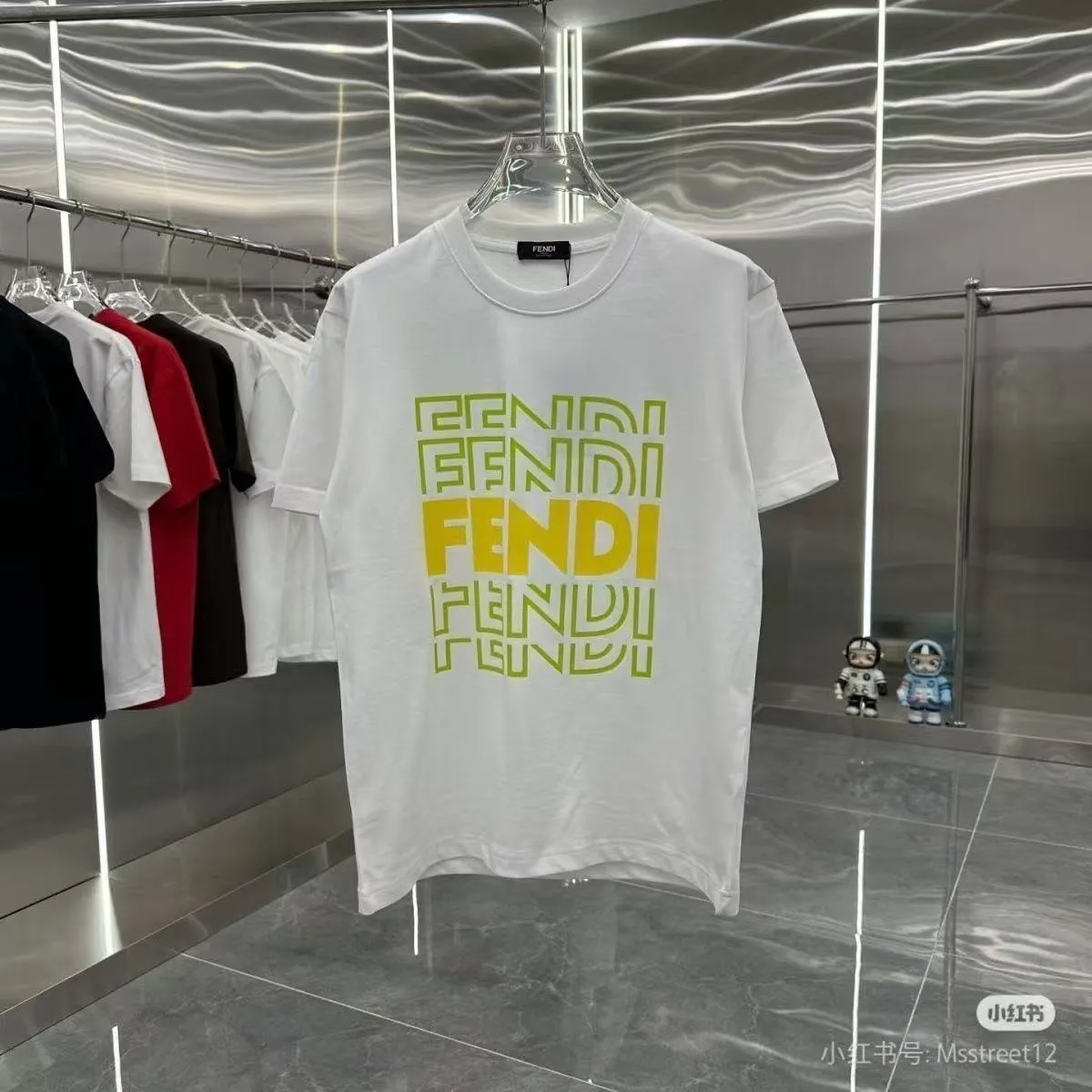 Elevate your casual wardrobe with this Fendi Logo T-Shirt. The bold yellow and green “FENDI” graphic on a sleek black background makes a statement, combining luxury with street style. Perfect for everyday wear.