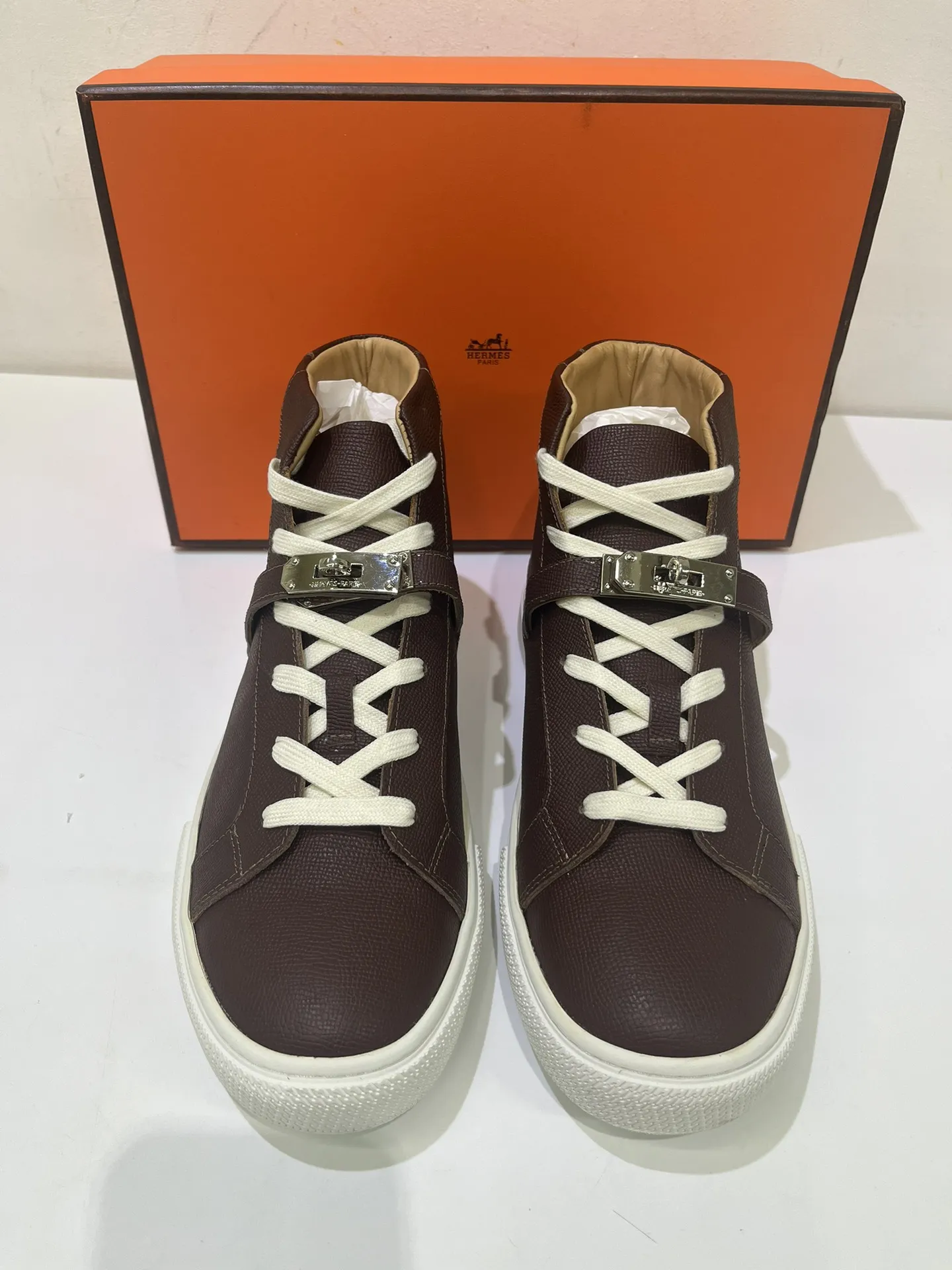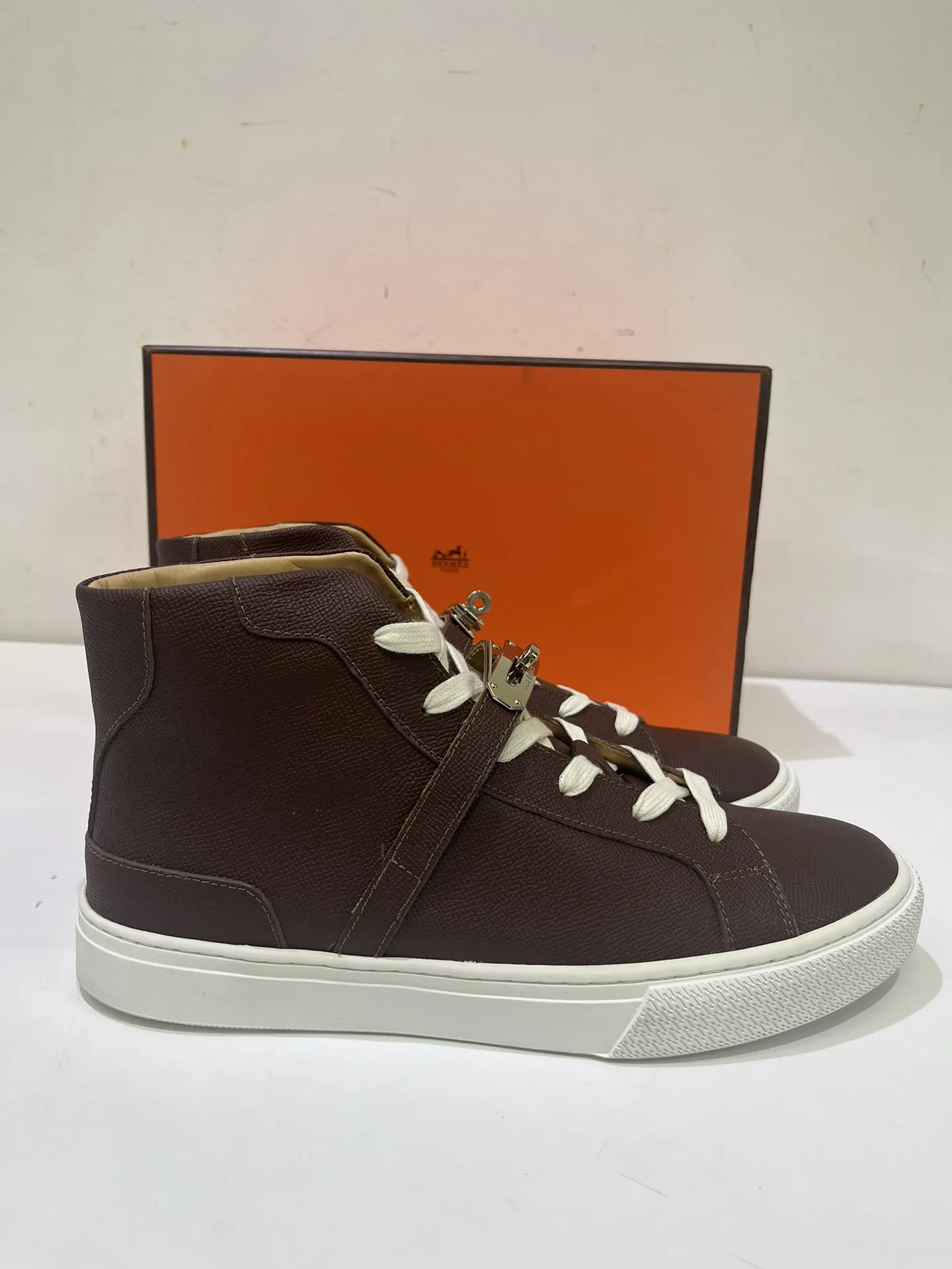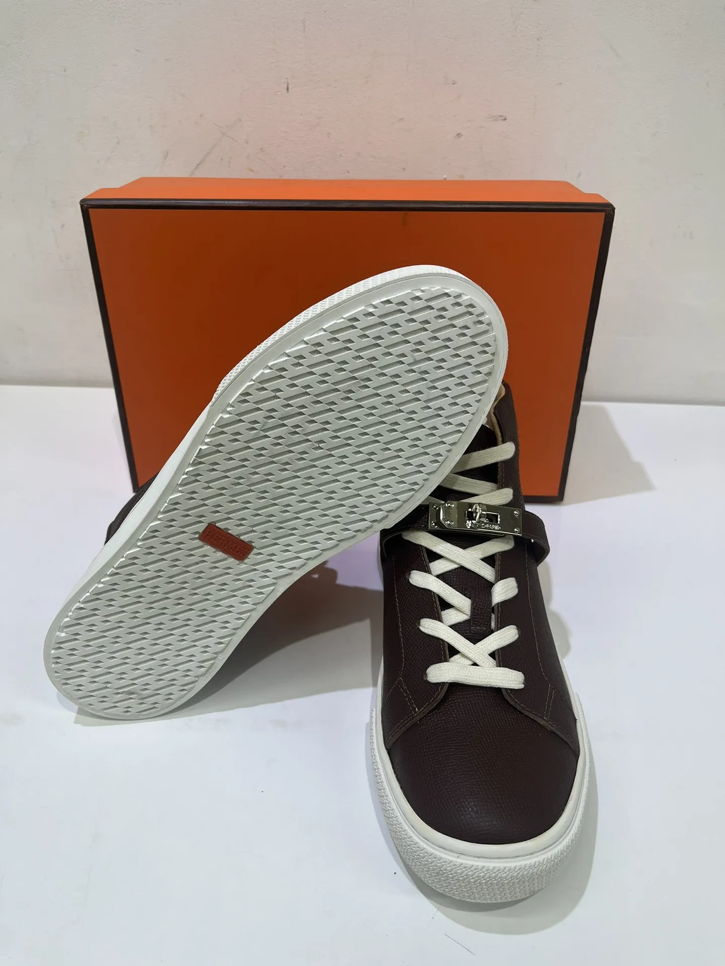 Step up your style with these HERMES high top sneakers in rich brown leather. The unique strap with a metal buckle adds a touch of luxury, while the lace-up design ensures a comfortable fit. Perfect for fashion-forward individuals.