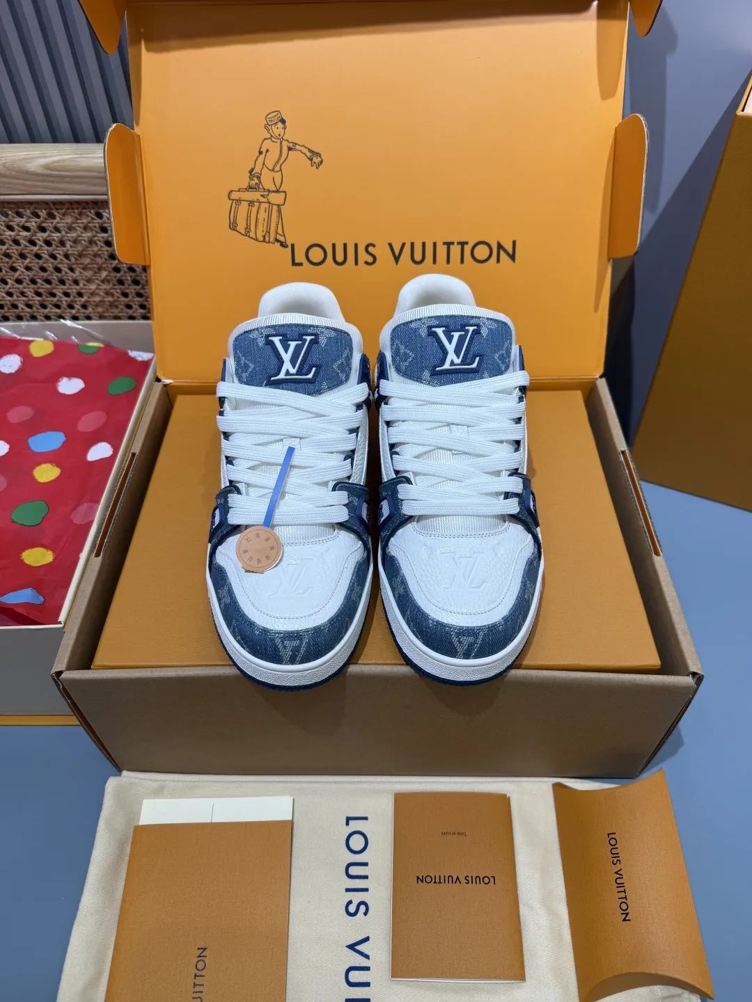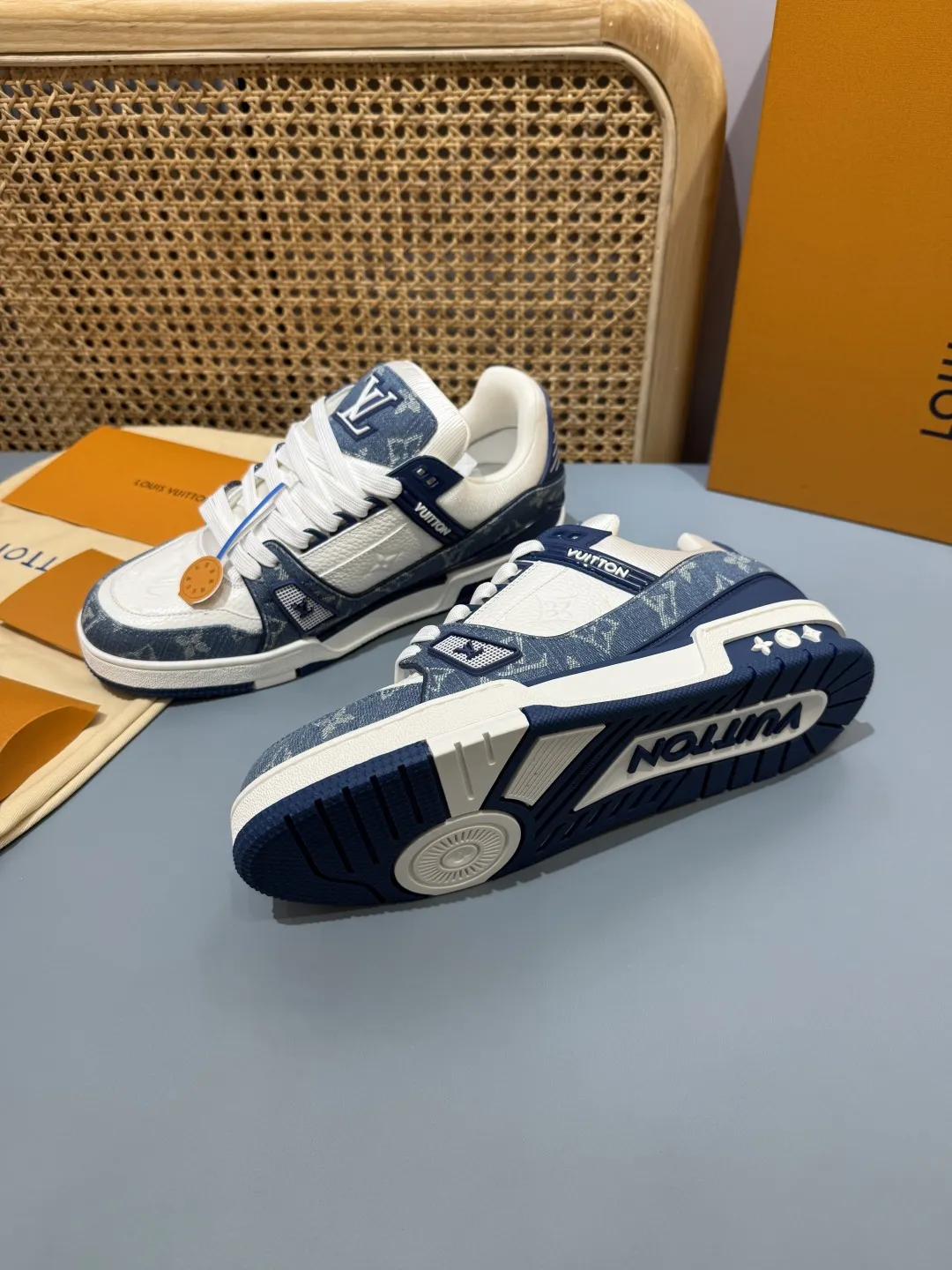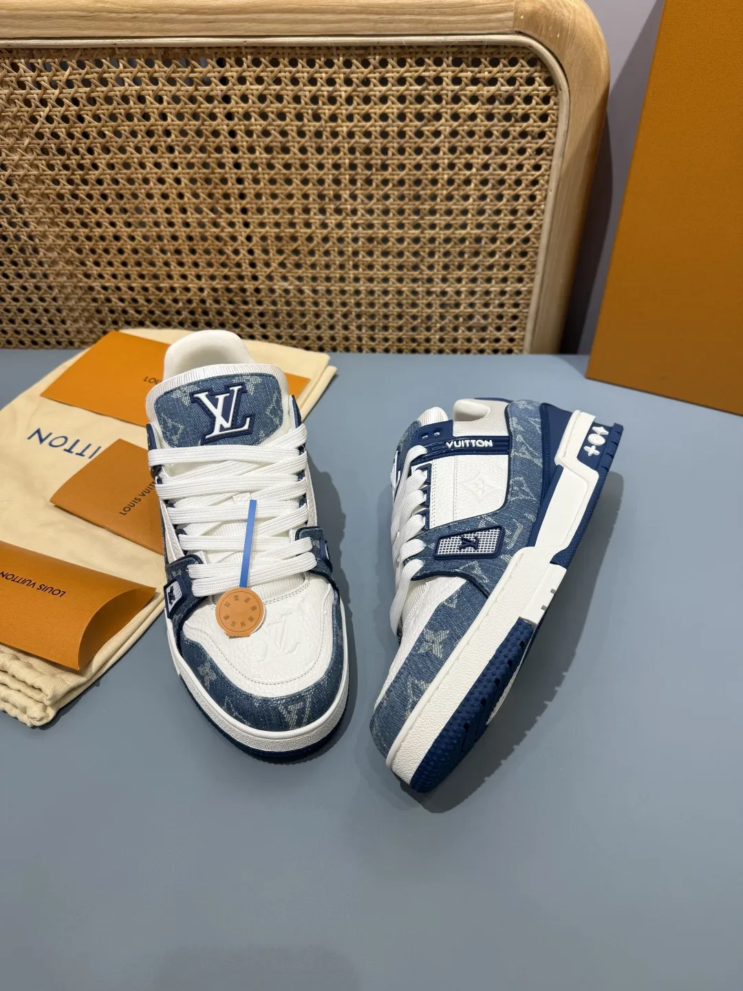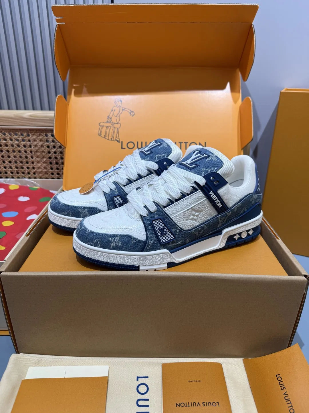 Step into style with these Louis Vuitton Trainer Denim Blue Casual Shoes, perfect for couples. Made from premium leather with custom-designed soles, they come in exclusive boutique packaging. Enjoy top-tier quality and unique design.